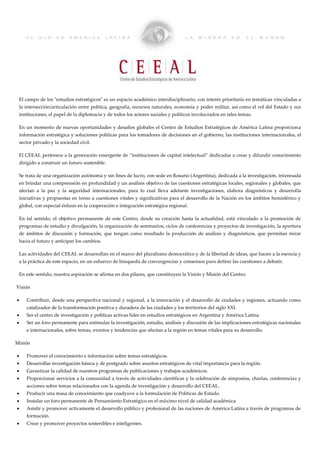 El Centro de Estudios Estratégicos de América Latina (CEEAL) es una organización sin fines de lucro dedicada a la investigación de temas estratégicos a nivel local, regional y global. Proporciona información e ideas a tomadores de decisiones en el gobierno, organizaciones internacionales y la sociedad civil. Su objetivo es promover el estudio y análisis de cuestiones estratégicas a través de eventos académicos y proyectos de investigación para ayudar a anticipar cambios y desarrollar políticas públic