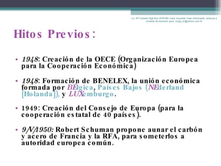 El documento detalla la historia de la integración europea desde 1957, comenzando con hitos clave como la creación de la CECA en 1951 y la CEE en 1957. Se mencionan los objetivos iniciales de integración económica, así como la evolución hacia el desarrollo de políticas comunes, incluyendo la energía nuclear y el comercio. A lo largo de las décadas, la evolución del proyecto europeo abarca la eliminación de barreras comerciales y la creación de un mercado común.