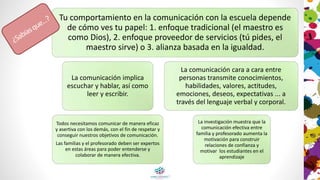 Este documento discute los estilos de comunicación entre las familias y el profesorado. Explica que la comunicación efectiva depende de la perspectiva adoptada (tradicional, de servicio o de alianza) y requiere escuchar, hablar, leer y escribir. Además, destaca que tanto las familias como el profesorado deben ser expertos en comunicación para entenderse y colaborar efectivamente en beneficio de los estudiantes.