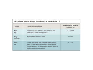 1. La cefalea es un dolor ubicado entre las orbitas y el occipucio que se origina en estructuras sensibles al dolor. 2. La migraña es una cefalea primaria de carácter agudo recurrente, con episodios que ocurren en crisis de duración no menor a 2 horas ni mayor a 72 horas, típicamente unilateral, pulsátil, acompañada de dolor abdominal, náuseas y/o vómitos o sonofobia y fotofobia. 3. El tratamiento de la migraña incluye opciones farmacológicas como