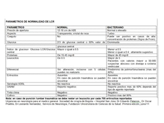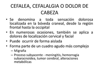 Este documento describe diferentes tipos de cefalea, incluyendo migraña, cefalea tensional y cefalea secundaria. Explica que la cefalea es dolor en la cabeza que puede tener múltiples causas y que es importante identificar signos de alarma que puedan indicar una causa subyacente. También resume los pasos para la evaluación de pacientes con cefalea, incluyendo historia clínica, examen físico, exámenes de imagen y de laboratorio.