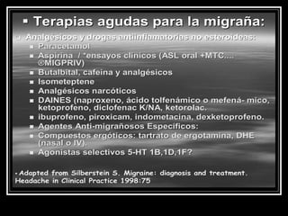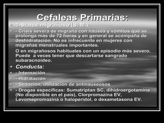 Este documento resume las cefaleas o dolores de cabeza desde una perspectiva médica. Explica que existen cefaleas primarias como la migraña y la tensión, y cefaleas secundarias asociadas a traumas, desórdenes vasculares u otras condiciones. Además, discute las hipótesis sobre la fisiopatología de las cefaleas y proporciona preguntas clave para el interrogatorio de pacientes que sufren de dolores de cabeza.