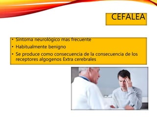 El documento trata sobre la cefalea. Describe que la cefalea es el síntoma neurológico más frecuente y puede afectar hasta al 50% de la población. Explica que la cefalea tensional y la migraña son los dos tipos más comunes. Detalla los enfoques de evaluación, diagnóstico e identificación de cefaleas primarias y secundarias, así como las opciones de tratamiento farmacológico y no farmacológico.