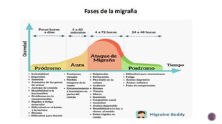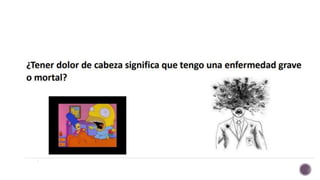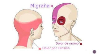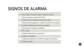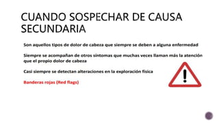 Este documento proporciona información sobre el diagnóstico y tratamiento de diferentes tipos de cefaleas primarias. Describe las características del dolor, diagnóstico diferencial y tratamiento de la crisis y profilaxis para la migraña, cefalea de tensión y cefalea en racimos. También incluye información sobre dosis de fármacos comúnmente utilizados y señales de alarma que requieren más evaluación.