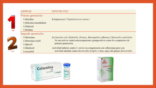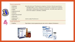 Las cefalosporinas son antibióticos β-lactámicos similares a las penicilinas pero más estables ante muchas lactamasas bacterianas, por lo que tienen un espectro más amplio de actividad. Se descubrieron en 1948 y continúan siendo importantes para el tratamiento de infecciones. Su mecanismo de acción implica inhibir la síntesis de la pared celular bacteriana. Existen cuatro generaciones clasificadas según su espectro, siendo las de tercera y cuarta generación las más efectivas contra bacterias Gram-neg