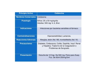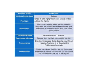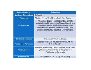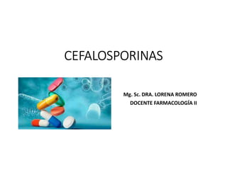 Las cefalosporinas son antibióticos beta-lactámicos derivados del hongo Cephalosporium acremonium. Presentan un núcleo cefem que les confiere resistencia a las penicilinasas y permite sustituyentes en C3 y C7, dándoles un amplio espectro antimicrobiano. Esto, junto con su potente actividad bactericida, farmacocinética favorable y baja toxicidad, las hace útiles para el tratamiento de infecciones comunitarias y nosocomiales. Se clasifican en generaciones basadas