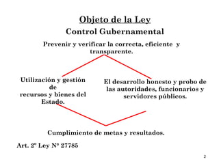 1) El documento habla sobre el control gubernamental y la auditoría, cuyo objetivo es supervisar, vigilar y verificar los actos y resultados de la gestión pública para asegurar la eficiencia, eficacia y transparencia en el uso de los recursos del Estado.