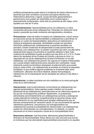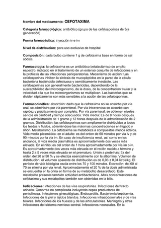 La cefotaxima es un antibiótico de amplio espectro de la familia de las cefalosporinas de tercera generación que se administra por vía intravenosa o intramuscular para tratar infecciones bacterianas. Se metaboliza principalmente en el hígado y se elimina por vía renal. Los efectos secundarios más comunes incluyen náuseas, vómitos y reacciones alérgicas. Se debe ajustar la dosis en pacientes con insuficiencia renal.