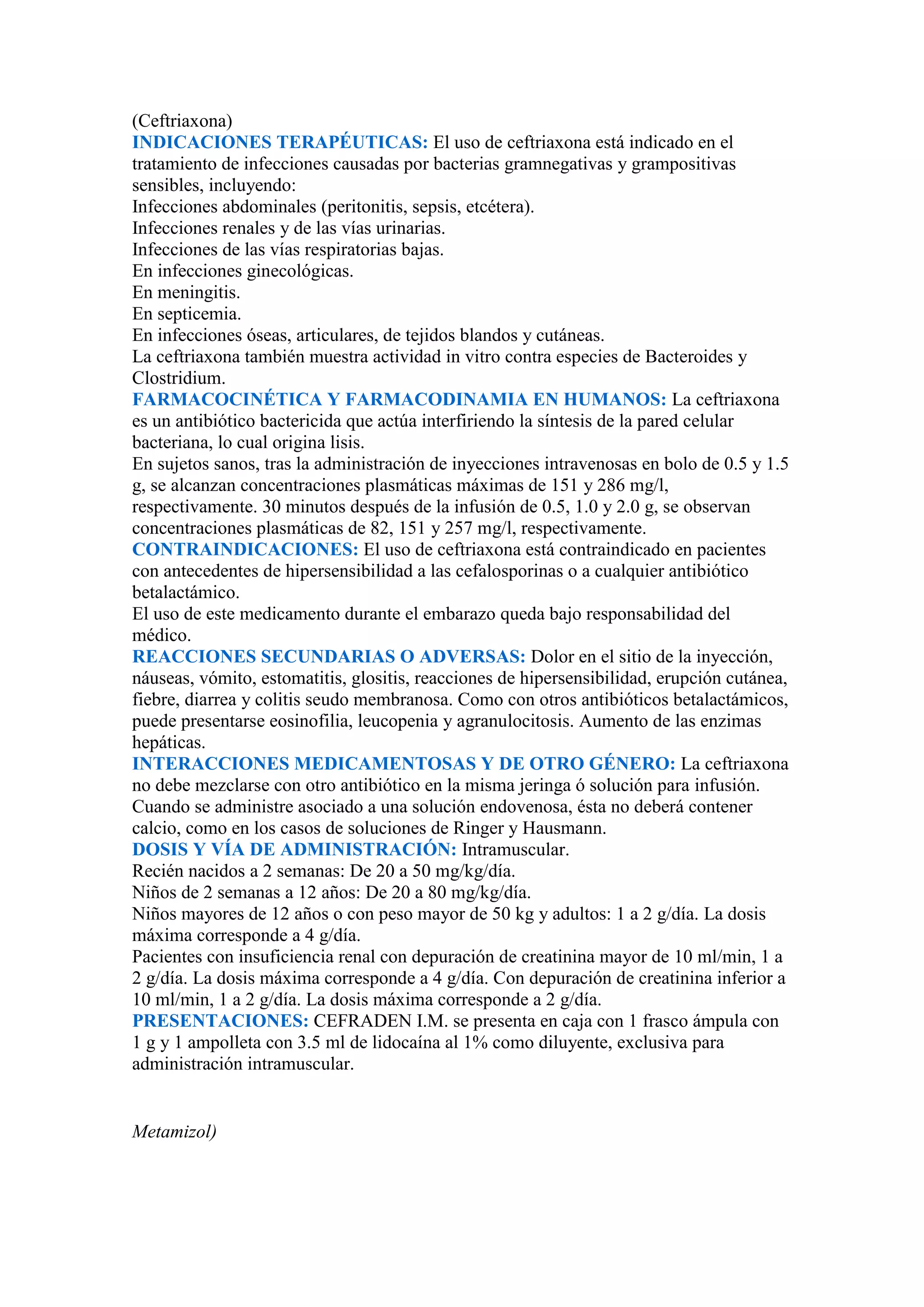 El documento proporciona información sobre la ceftriaxona, un antibiótico utilizado para tratar infecciones causadas por bacterias. Indica las infecciones que puede tratar, como infecciones abdominales, renales, respiratorias y ginecológicas. Describe su farmacocinética, contraindicaciones, efectos secundarios y dosis recomendadas. También proporciona detalles sobre el metamizol, un analgésico, y el cloranfenicol, otro antibiótico.