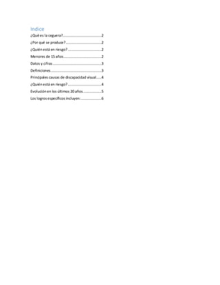 La ceguera es la pérdida total o parcial de la visión. Aproximadamente 285 millones de personas en el mundo padecen discapacidad visual, de las cuales 39 millones son ciegos. Los principales factores de riesgo son la edad (más de 50 años) y vivir en países de bajos ingresos. En las últimas dos décadas se han logrado avances significativos en la prevención y tratamiento de la ceguera, como la reducción de casos relacionados con enfermedades infecciosas y el aumento del acceso a