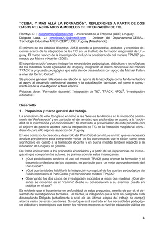Este documento resume dos estudios relacionados con modelos de integración de TIC en la educación en Uruguay y reflexiona sobre el desafío de aplicar estos modelos en el aula. En particular, analiza el Plan Ceibal y su evolución, así como el potencial del modelo TPACK para orientar la formación docente y mejorar la integración de TIC con fines educativos.