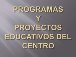 Este documento presenta la declaración de intenciones y proyectos de un centro escolar para crear una comunidad de aprendizaje basada en valores como la solidaridad y el respeto. Describe iniciativas en diferentes áreas como la educación, la salud, el medio ambiente, las tecnologías y la colaboración con la comunidad. El objetivo final es formar ciudadanos constructivos y críticos.