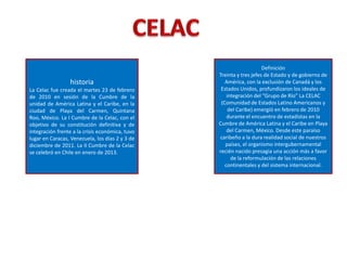La Celac fue creada en 2010 en México con el objetivo de fortalecer la integración de América Latina y el Caribe. Actualmente cuenta con 33 países miembros. Sus cumbres se han realizado en Venezuela, Chile y otros países, buscando profundizar la cooperación en áreas como seguridad alimentaria, desarrollo sostenible y derechos humanos. Algunos de los beneficios de la Celac incluyen mejores relaciones comerciales, acceso a insumos agrícolas y aportes a la tecnología e infraestruct