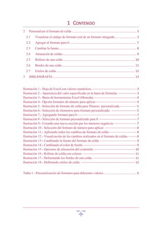 Este documento describe cómo personalizar el formato de celdas en Excel. Explica cómo ver el código de formato de un formato integrado como Moneda y cómo personalizarlo agregando formatos para cero y números negativos. También cubre cómo cambiar la fuente, alineación, relleno, bordes y estilos de celda. Proporciona capturas de pantalla para ilustrar cada paso del proceso de personalización del formato de celdas.