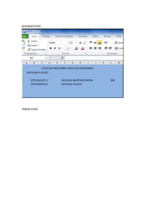 El documento describe los pasos para repetir formatos de celdas en una hoja de cálculo. Primero se especifican los nombres de dos estudiantes y sus números. Luego se enumeran los tres pasos para aplicar formatos de celdas de manera repetida, aunque no se describen los pasos específicos.