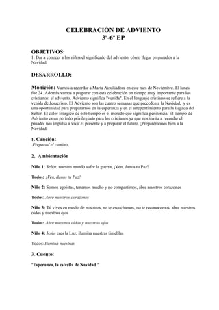 El documento presenta una celebración del Adviento para niños con el objetivo de enseñarles el significado de este tiempo y cómo prepararse para la Navidad. La celebración incluye oraciones, lecturas, un cuento y canciones enfocadas en esperar la llegada de Jesús y preparar los corazones para recibirlo.