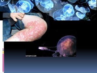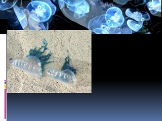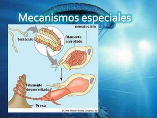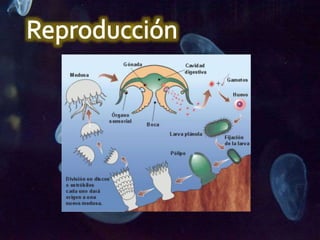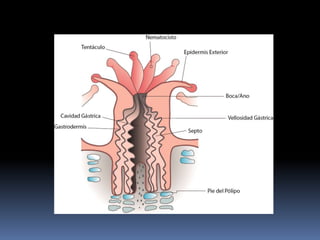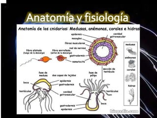 Los Cnidarios presentan dos formas: el pólipo, que es la fase fija, y la medusa, que es la fase libre. Los pólipos tienen forma de saco y se fijan a sustratos, donde pueden vivir solos o en colonias. Se alimentan con sus tentáculos urticantes y digieren presas en su cavidad gastrovascular. Las medusas tienen forma de campana y se alimentan con sus largos brazos, pudiendo moverse verticalmente pero no horizontalmente.