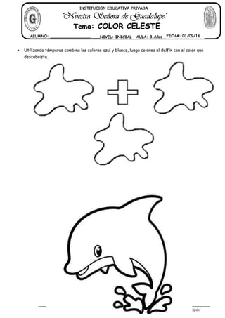El documento proporciona instrucciones para un proyecto de arte en el que los estudiantes de 3 años deben combinar los colores azul y blanco para descubrir el color celeste y luego usarlo para colorear un delfín.