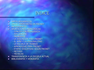 Celestine Freinet fue un innovador pedagogo francés del siglo XX que buscó actualizar la escuela tradicional centrándola en el niño. Propuso una escuela de trabajo basada en el aprendizaje experimental y el desarrollo de la personalidad del estudiante. Desarrolló técnicas como el texto libre, el diario escolar y la correspondencia interescolar que promovían la expresión, cooperación y participación.