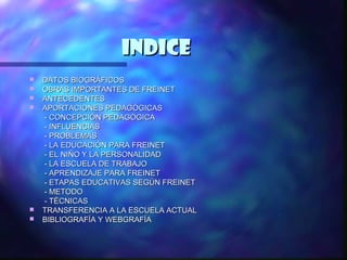 Celestine Freinet fue un pedagogo francés que propuso una nueva concepción de la escuela centrada en el niño. Creía que los niños deben ser los protagonistas de su propio aprendizaje a través de la práctica y el ensayo-error. Desarrolló técnicas como el texto libre, el diario escolar y la correspondencia entre escuelas que fomentaban la expresión, cooperación y participación de los estudiantes. Sus ideas influyen aún en la escuela actual y promueven un enfoque más natural del aprendizaje