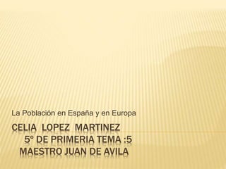 El documento habla sobre la población en España y Europa. Explica conceptos como el censo, el padrón municipal, la natalidad, mortalidad, emigración e inmigración. Señala que la población española no se distribuye uniformemente en el territorio y que hasta 1975 España era un país de emigrantes hacia el exterior y el interior. También describe la clasificación de la población en activa y no activa, y analiza la distribución y características demográficas de la población en Europa.
