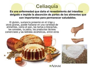 La enfermedad celiaca daña el revestimiento intestinal impidiendo la absorción de nutrientes. Se diagnostica mediante exámenes de sangre y biopsia intestinal. No tiene cura, pero los síntomas desaparecen siguiendo una dieta estrictamente sin gluten de por vida.