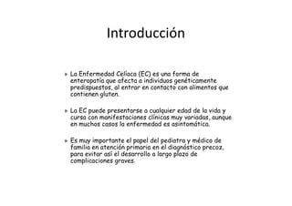 La enfermedad celíaca es una intolerancia permanente a las proteínas del gluten que afecta a individuos genéticamente predispuestos. Puede presentarse a cualquier edad con manifestaciones clínicas variables. El único tratamiento eficaz es una dieta estricta sin gluten de por vida. Es importante el diagnóstico temprano por parte de atención primaria para evitar complicaciones a largo plazo.