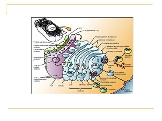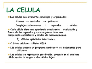 Este documento trata sobre biología celular. Describe que las células son altamente complejas y organizadas, y están compuestas de átomos, moléculas, polímeros y organelos. Cada célula posee un programa genético y los mecanismos para utilizarlo, así como la capacidad de dividirse, adquirir y utilizar energía, y responder a estímulos. Las células procariotas y eucariotas comparten características como la membrana plasmática, la presencia de ADN y mecanismos simil