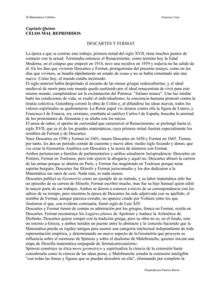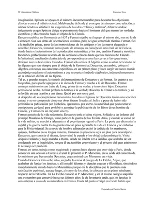 Este documento compara a los matemáticos René Descartes y Pierre de Fermat, quienes vivieron en la primera mitad del siglo XVII. Ambos realizaron importantes contribuciones a las matemáticas, aunque sus enfoques eran diferentes. Descartes creó la geometría analítica y consideraba las matemáticas como un episodio en su carrera filosófica. Fermat hizo contribuciones fundamentales a la teoría de números y mantuvo una estrecha relación con la geometría. A pesar de sus diferencias, ambos ayudaron a