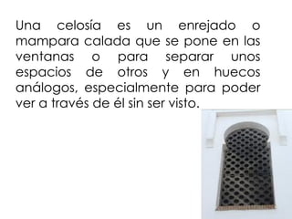 El documento describe los pasos para fabricar celosías, incluyendo secado, encolado, lijado, pintado y tratamiento de la madera, así como los materiales comunes utilizados como pino, haya y roble. También menciona algunos usos comunes de las celosías como en parques, jardines y centros comerciales, y sus beneficios como resistencia al viento, durabilidad, estética y privacidad.