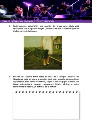 El documento describe una actividad educativa centrada en la música del grupo español Celtas Cortos, donde los estudiantes participan en diversas tareas relacionadas con la escucha y análisis de sus canciones. Se incluyen ejercicios de identificación de letras, creación de historias y reflexión sobre temas como la emigración. También se fomenta la creatividad mediante la elaboración de estribillos de canciones críticas sociales.