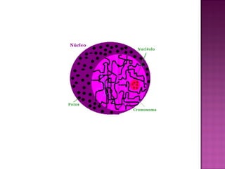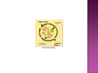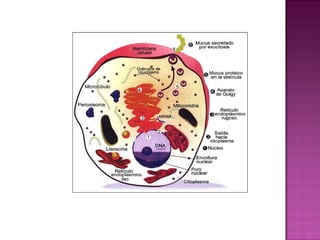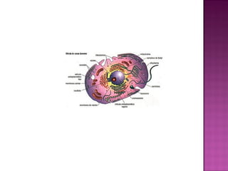 La célula está compuesta de varias estructuras como la membrana, el núcleo, los mitocondrias y los lisosomas. El núcleo contiene el ADN que controla las funciones de la célula y su reproducción a través de los cromosomas. La célula utiliza los alimentos para obtener energía y sintetizar proteínas y otras sustancias que se usan para el crecimiento celular y la división.