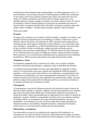 Las células son la unidad básica de los organismos vivos. Existen células procariotas y eucariotas, siendo las primeras más pequeñas y simples como las bacterias, mientras que las segundas son mayores y contienen organelos como el núcleo y las mitocondrias. Todas las células comparten características como la membrana, el ADN y los procesos metabólicos, aunque varían en tamaño, forma y función según el organismo al que pertenezcan.