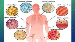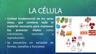 Las células son la unidad básica de los seres vivos. Existen dos tipos principales de células: procariotas y eucariotas. Las procariotas carecen de núcleo y su material genético está disperso, mientras que las eucariotas poseen un núcleo que contiene su material genético. Todas las células comparten estructuras como la membrana, citoplasma y organelos, pero las células vegetales adicionalmente contienen cloroplastos, vacuolas y pared celular.