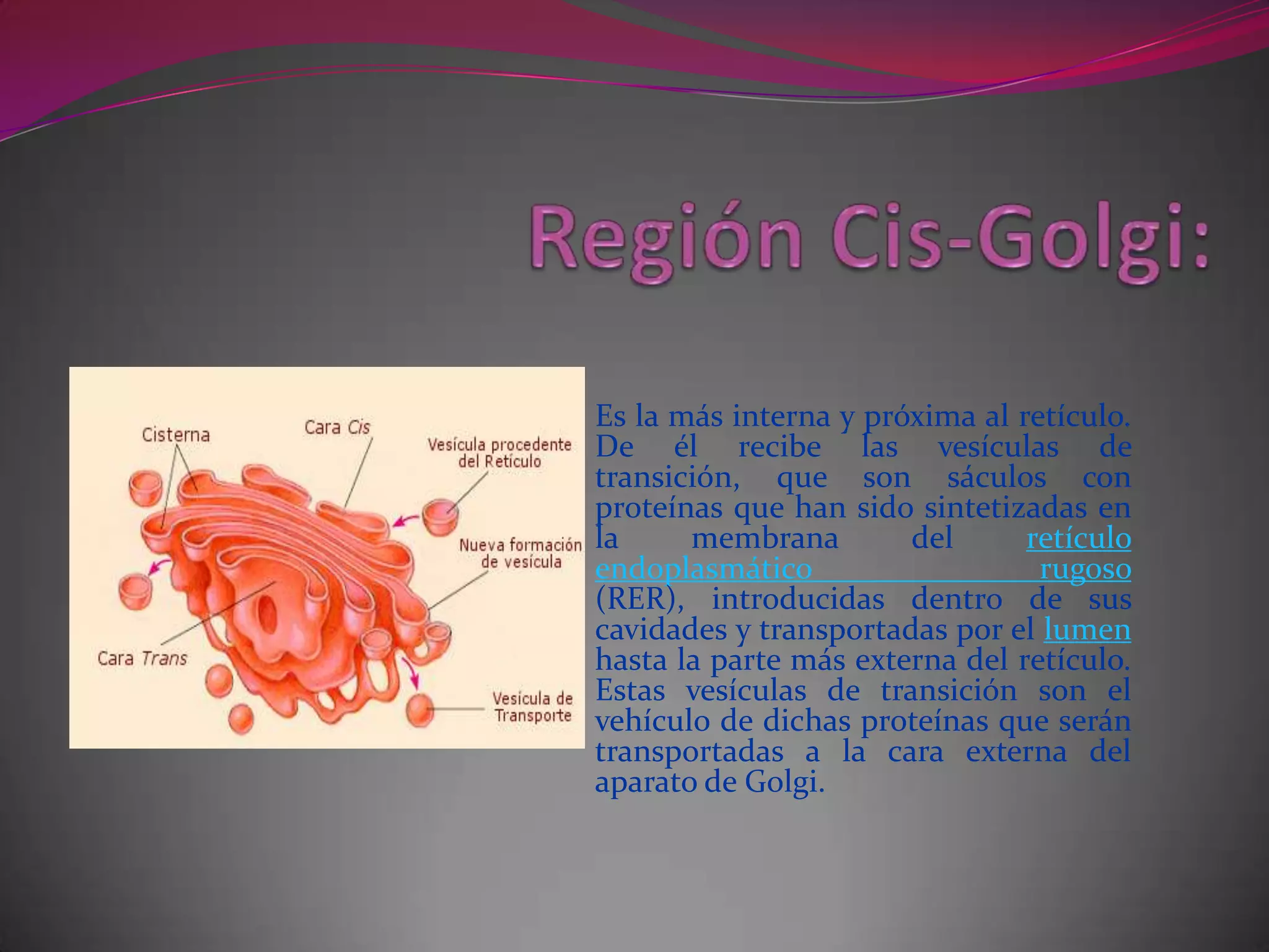 El documento describe que el retículo endoplasmático rugoso sintetiza proteínas en su membrana y las introduce en vesículas de transición dentro de su luz. Estas vesículas transportan las proteínas a través del lumen hasta la parte más externa del retículo, para luego ser transportadas a la cara externa del aparato de Golgi.
