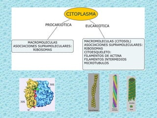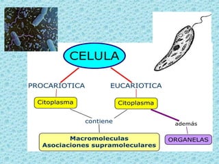 El documento describe las características básicas de las células, incluyendo que son las unidades fundamentales de todos los seres vivos, que contienen membranas, citoplasma y núcleos, y que existen dos tipos principales de células, procariotas y eucariotas.