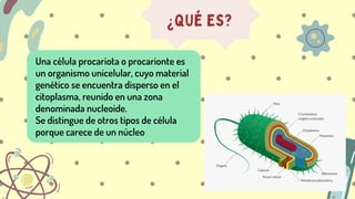 La célula procariota es una célula unicelular que carece de núcleo. Su material genético se encuentra disperso en el citoplasma en una zona llamada nucleoide. Está delimitada por una pared celular y una membrana plasmática. Realiza funciones como la transcripción, traducción, intercambio de sustancias, obtención de energía y alimentación. Se reproduce de forma asexual por división celular. Incluye bacterias y arqueas importantes que desempeñan funciones como la descomposición y la fijación