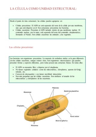 La teoría celular establece que (1) la célula es la unidad estructural y funcional de los seres vivos, y (2) toda célula proviene de otra preexistente. Se formuló en el siglo XIX gracias al desarrollo del microscopio, que permitió ver las células. Existen dos tipos de células: procariotas como las bacterias, cuyo ADN no tiene membrana, y eucariotas como las animales y vegetales, cuyo ADN está dentro del núcleo.