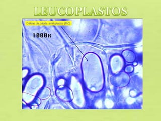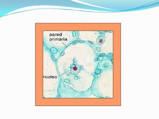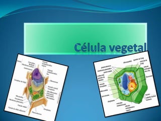 Este documento describe varias partes y estructuras clave de la célula vegetal. Incluye una vacuola central que contiene jugo celular, tilacoides que absorben la luz solar durante la fotosíntesis, una pared celular que protege el contenido celular y da rigidez, y un citosol que representa el medio interno del citoplasma. También describe orgánulos como el retículo endoplasmático rugoso involucrado en la síntesis de proteínas y los plasmodesmos que conectan el citoplasma entre células