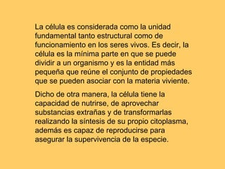 La célula es la unidad básica de los seres vivos y está constituida por una membrana, citoplasma y organelos como el núcleo, mitocondrias y retículo endoplasmático. Las células se reproducen a través de la división celular y existen en dos tipos: procariotas y eucariotas. Los científicos Schleider, Schwann y Weimann hicieron contribuciones importantes al estudio de la célula y la teoría celular.