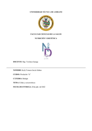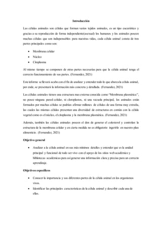 Este documento describe la célula animal, incluyendo sus partes y características. Explica que la célula animal carece de pared celular y cloroplastos, y se compone de una membrana, núcleo y citoplasma. Detalla las partes de la célula animal como lisosomas, retículo endoplasmático, núcleo, aparato de Golgi, citoplasma, microtúbulos y ribosomas. Concluye que la célula animal es la unidad básica de los tejidos y órganos, y gra
