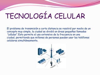 El documento habla sobre la tecnología celular y cómo se resolvió el problema de transmisión a corta distancia dividiendo las ciudades en pequeñas áreas llamadas "células", lo que permite que millones de personas usen teléfonos celulares simultáneamente. También compara las características del Samsung Galaxy S5 y el Sony Xperia Z2, incluyendo sus pantallas Full HD, procesadores y memoria.