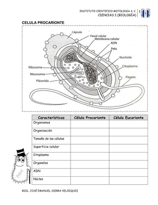 El documento describe las características de las células procariotas y eucariotas. Explica que las células procariotas son más pequeñas, no tienen núcleo ni organelos, y su ADN no está encerrado en un núcleo. Las células eucariotas son más grandes y complejas, contienen un núcleo y varios organelos como la mitocondria, cloroplasto y retículo endoplasmático. También enumera las funciones de los diferentes organelos encontrados en las células animales y vegetales.