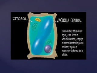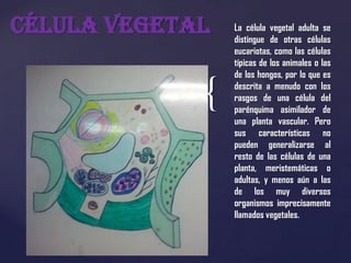 El documento describe varias características de las células vegetales. En particular, destaca que las células vegetales adultas tienen una gran vacuola central que ocupa el 90% del volumen celular, reduciendo el citoplasma a una delgada capa. Además, las células contienen tilacoides en los cloroplastos donde se produce la fotosíntesis, y una pared celular externa rígida. Finalmente, las células vegetales se diferencian de otros tipos de células eucariotas por estas características.