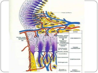 El documento describe las diferentes células que componen el tejido óseo, incluyendo osteoblastos, osteocitos y osteoclastos. Explica sus funciones en la formación, mantenimiento y remodelado del hueso, así como los procesos de osificación endocondral e intramembranosa. También aborda aspectos fisiológicos como la regulación hormonal del crecimiento óseo y la mineralización de la matriz ósea.