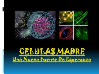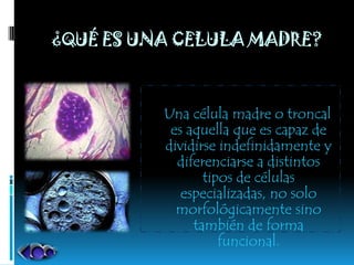 Este documento describe las células madre, incluyendo su definición, características, clasificación, fuentes, métodos de obtención y cultivo, y aplicaciones clínicas potenciales. Las células madre son células no especializadas que pueden dividirse y diferenciarse en otros tipos de células. Existen células madre embrionarias y adultas, las cuales pueden ser totipotentes, pluripotentes o multipotentes. Se exploran posibles usos terapéuticos en condiciones como el cáncer y la diabetes