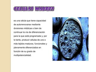 Este documento describe las células madre, incluyendo que son células que pueden autorrenovase o diferenciarse en otros tipos de células, tienen aplicaciones en terapias celulares y medicina regenerativa, y pueden clasificarse como pluripotentes, totipotentes, multipotentes o unipotentes dependiendo de su capacidad de diferenciación. También resume las fuentes de células madre embrionarias y adultas y los métodos para obtener células madre, como embriones crioconservados o activación de ovocitos.