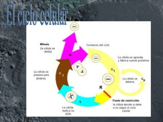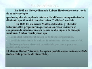 El documento resume la teoría celular, explicando que en el siglo XVII Hooke observó células a través del microscopio y que en 1838 Schleiden y Schwann propusieron que todos los organismos están compuestos de células. Describe las características de las células procariotas y eucariotas, y explica los componentes clave de las células como la membrana, citoplasma, organelos y núcleo. También resume las etapas del ciclo celular, incluida la replicación del ADN y la división celular.