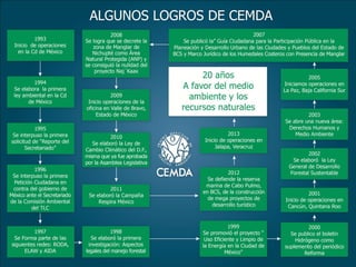 El Centro Mexicano de Derecho Ambiental (CEMDA) es una organización sin fines de lucro cuyas misiones son promover el derecho a un ambiente sano mediante el desarrollo y cumplimiento de la legislación y políticas ambientales de México, mejorar la calidad de vida de las personas, y trabajar para garantizar y difundir el derecho a un medio ambiente sano. CEMDA opera en varias oficinas en México y se rige por principios como la justicia, la dignidad humana y el desarrollo sustentable.