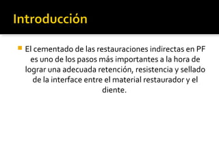 El cementado de las restauraciones indirectas en prótesis fija es uno de los pasos más importantes para lograr una adecuada retención, resistencia y sellado de la interfase entre el material restaurador y el diente, determinando la duración a largo plazo de la restauración. No existe un cemento ideal por lo que se debe examinar cada caso clínico para elegir el tipo de cemento considerando factores como la vitalidad dental, nivel cervical y tipo de restauración.